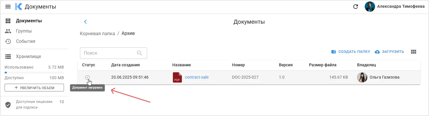 После загрузки в нижней части экрана появится уведомление с количеством загруженных файлов, которые автоматически сохранятся в текущей папке со статусом «Документ загружен», а действие будет записано в Журнал событий.