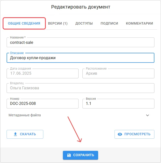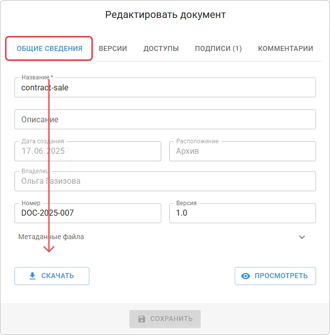 В открывшейся форме Редактировать документ перейдите на вкладку Общие сведения и нажмите на кнопку Скачать.