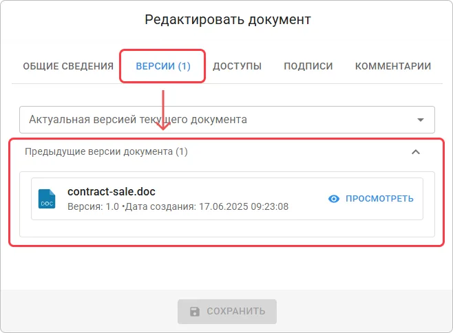 - В открывшейся форме Редактировать документ перейдите на вкладку Версии.