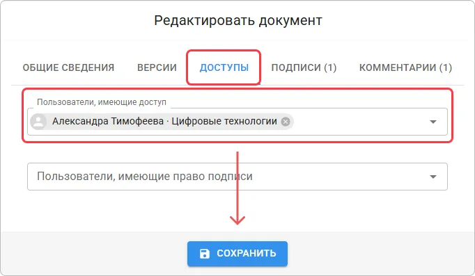 В открывшейся форме Редактировать документ перейдите на вкладку Доступы.
