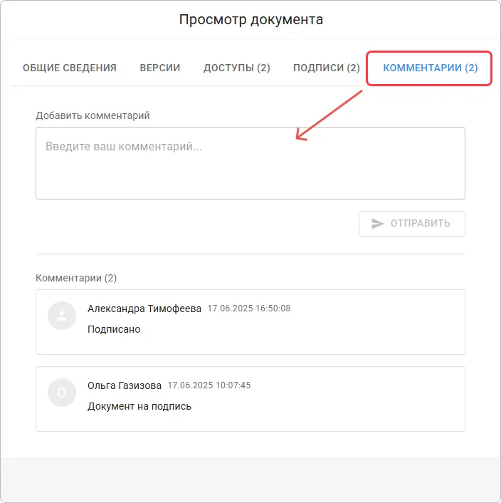 В открывшейся форме Редактировать документ перейдите на вкладку Комментарии.