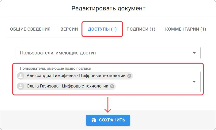 В открывшейся форме Редактировать документ перейдите на вкладку Доступы.