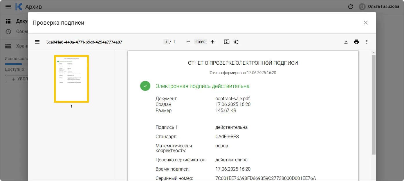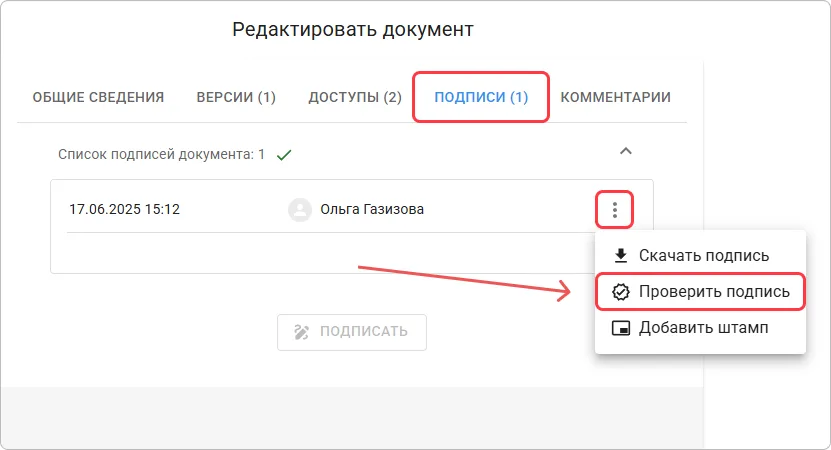- Если подпись действительна — файл подписи будет сохранён во вкладке Подписи, а статус документа обновится.