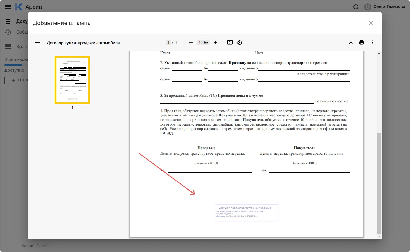 - Статус документа обновляется на Подписан 1 стороной или Подписан 2 сторонами (если документ содержит 2 подписи).