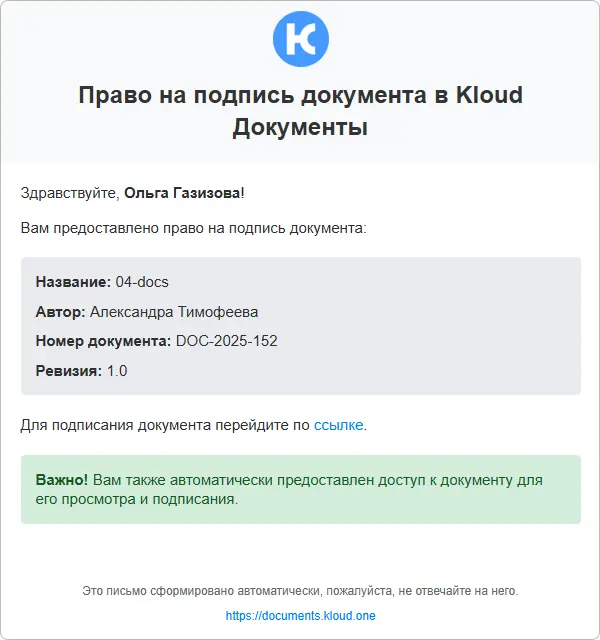 💡 Если вас назначили подписантом, вы можете открыть документ по ссылке из email-уведомления.