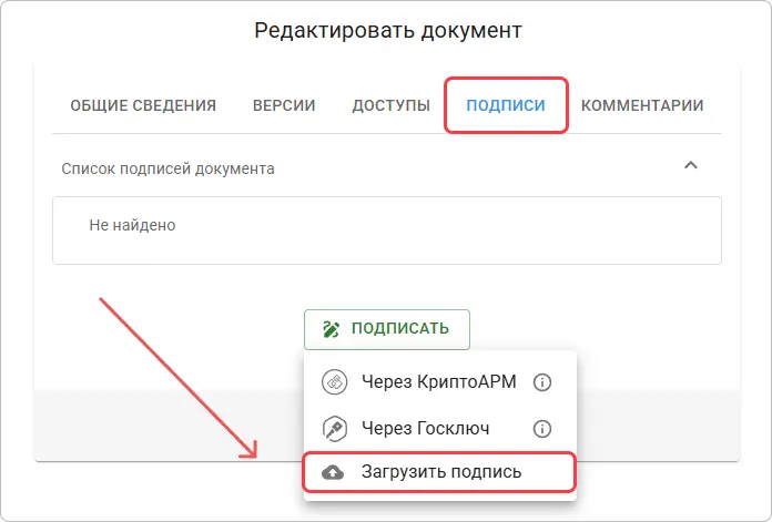 - Если документ уже был подписан вне сервиса (например, в КриптоАРМ или другой системе), вы можете загрузить файл подписи вручную.
