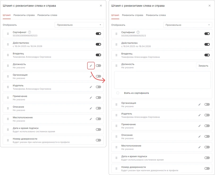 💡 Примечание: По умолчанию в поле Владелец штампа отображается значение Общее имя (CN) из сертификата. Если в сертификате указано название организации, а требуется вывести ФИО подписанта, откройте Настройки визуализации → Внешний вид → Редактировать в блоке «Реквизиты», выберите тип штампа «Произвольно» и включите переключатель «ФИО».