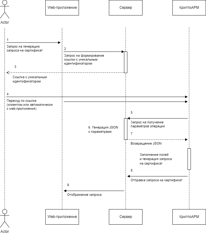 cryptoarm://- зарегистрированный протоколcertrequests- выполняемая команда<URL>- ссылка, на которую КриптоАРМ будет слать запросыid- уникальный идентификатор транзакции