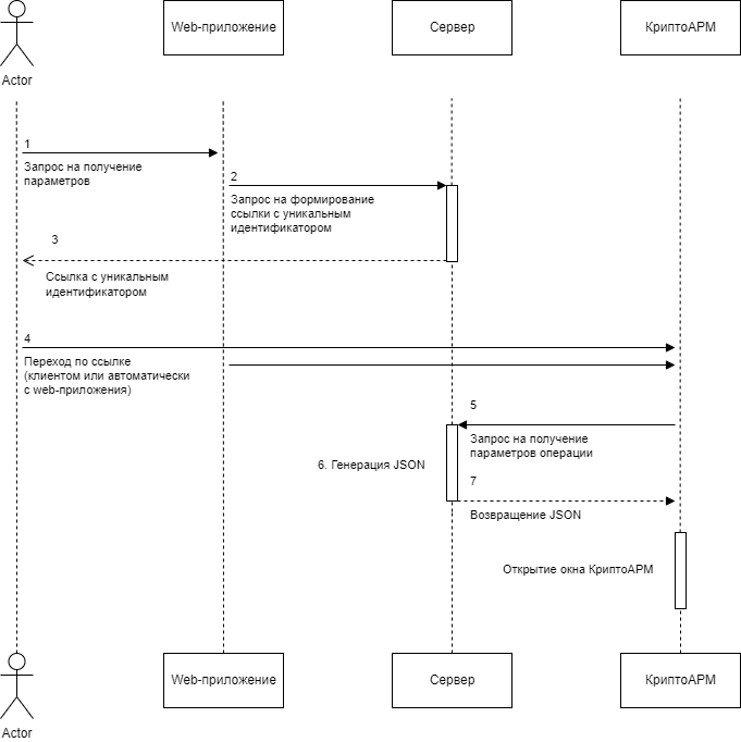 cryptoarm://- зарегистрированный протоколdiagnostics- выполняемая команда<URL>- ссылка, на которую КриптоАРМ будет слать запросыid- уникальный идентификатор транзакции