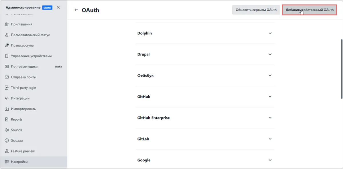 Перейдите в подраздел Настройки и нажмите Открыть в блоке OAuth.