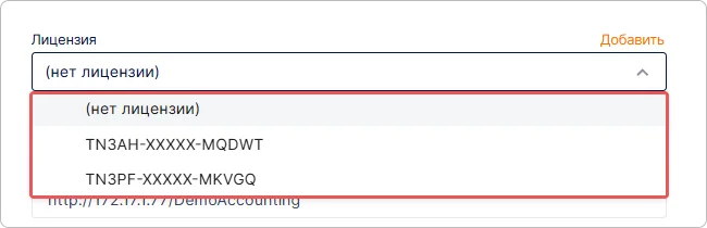 💡 Совет: Если в списке нет лицензии, сначала загрузите ее через кнопку Добавить.