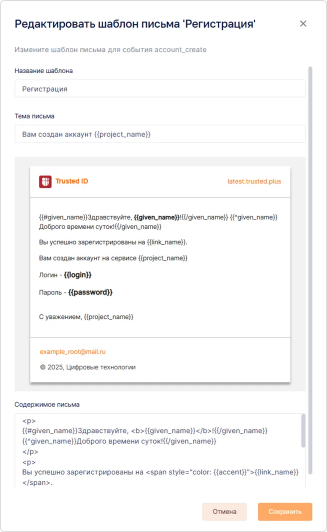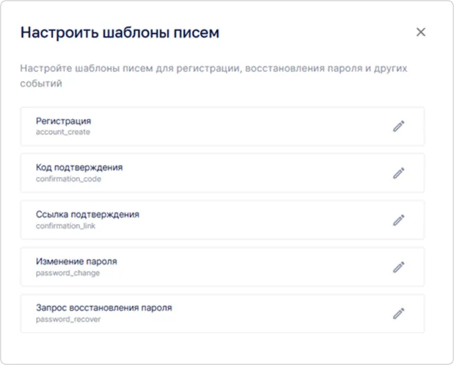 Шаблоны писем — это заготовки электронных писем, которые содержат предустановленное форматирование и элементы оформления. Они используются для создания автоматических уведомлений, таких как письма о регистрации, восстановлении пароля и других событиях.