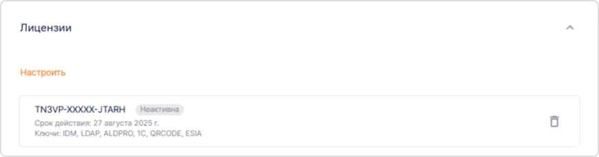 Лицензия сохраняется со статусом «Неактивна». После привязки к провайдеру статус лицензии будет заменен на «Активна».