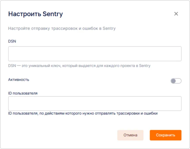 - Активность — при включении настройки активируется подключение Sentry и запускается отправка ошибок.