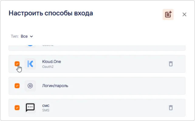 - Удаление способа входа с виджета не удаляет способ входа из системы. Происходит отключение данного способа входа для сервиса Trusted.ID.