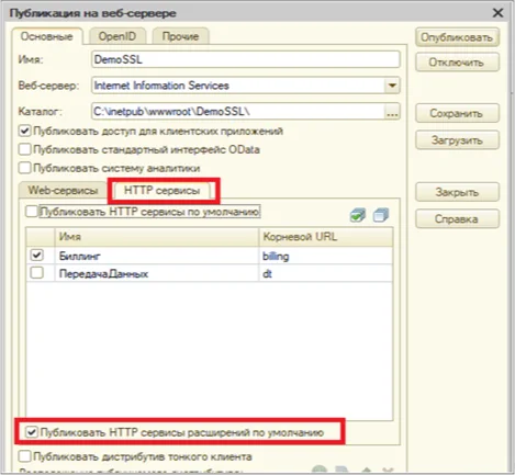 Установите признак Публиковать HTTP сервисов расширения по умолчанию для работы http-сервисов расширения.