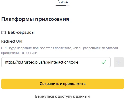 | Возвратный URL (не редактируемое) | Redirect URI | Адрес Trusted.ID, на который пользователь перенаправляется после аутентификации в стороннем сервисе |