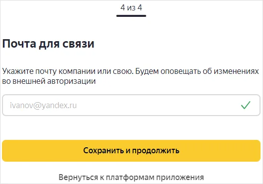 На четвертом шаге формы укажите почту для связи и нажмите кнопку Сохранить и продолжить.