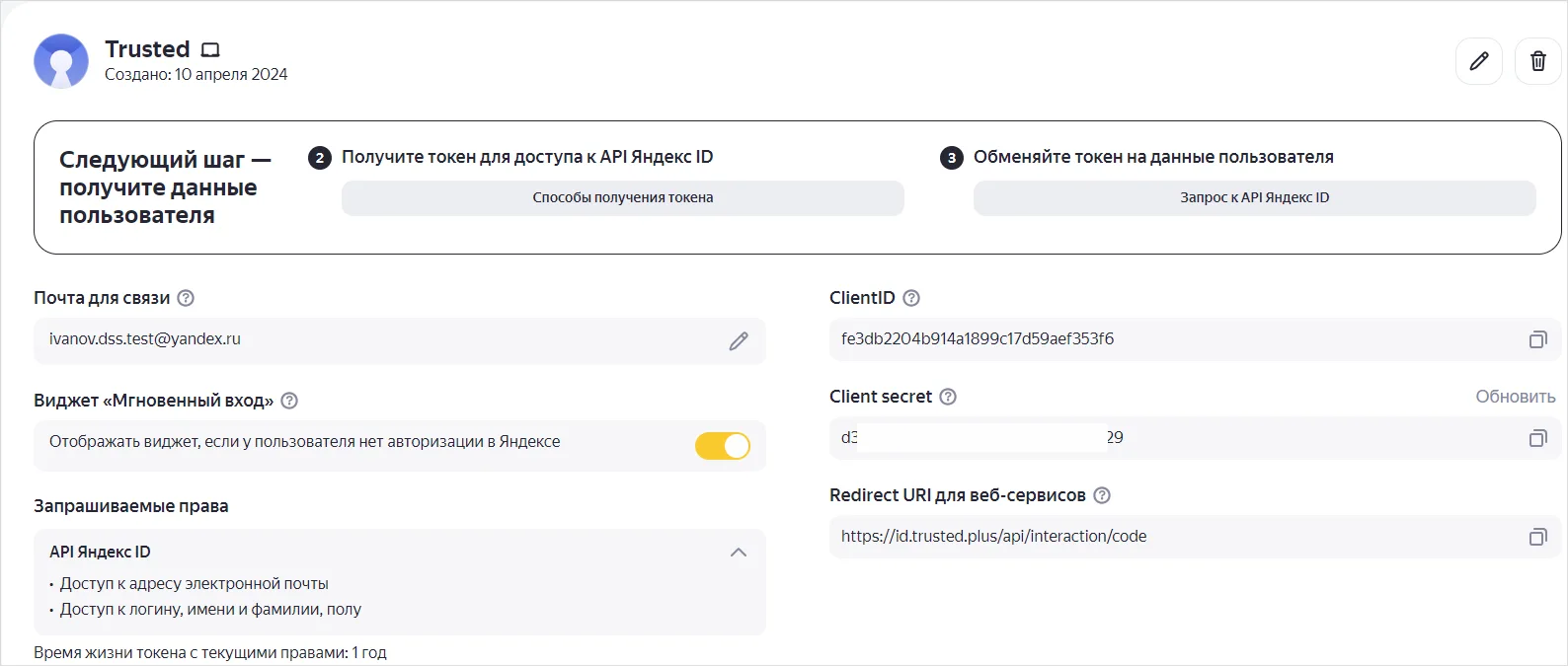 Скопируйте значения полей Client ID и Client Secret. Они понадобятся при создании приложения в Trusted.ID.
