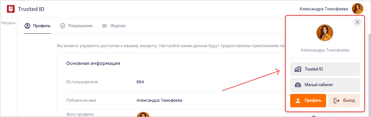 Виджет представляет собой меню с информацией о пользователе и основными действиями — например, переходом в интерфейс Trusted ID или выходом из системы. Он появляется при клике на аватар пользователя, который расположен в правом верхнем углу экрана.