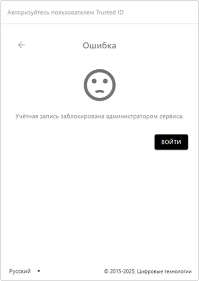 Заблокированный пользователь не сможет войти в сервис и приложения. При попытке входа будет отображаться следующий виджет: