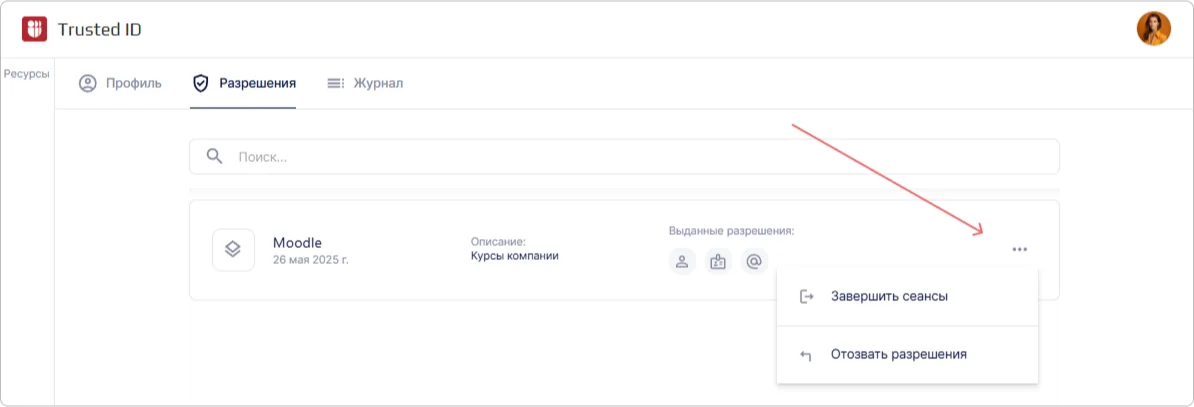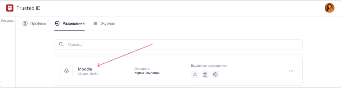 В Профиле на вкладке Разрешения отображается список информационных систем, к которым у вас есть доступ через Trusted ID и для которых вы предоставили такие разрешения.