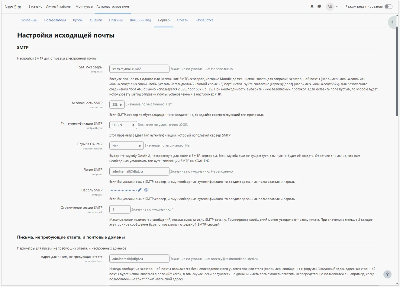 В случае, когда в СДО требуется отправка писем пользователям, то необходимо выполнить настройки почты (если ранее не были заданы):