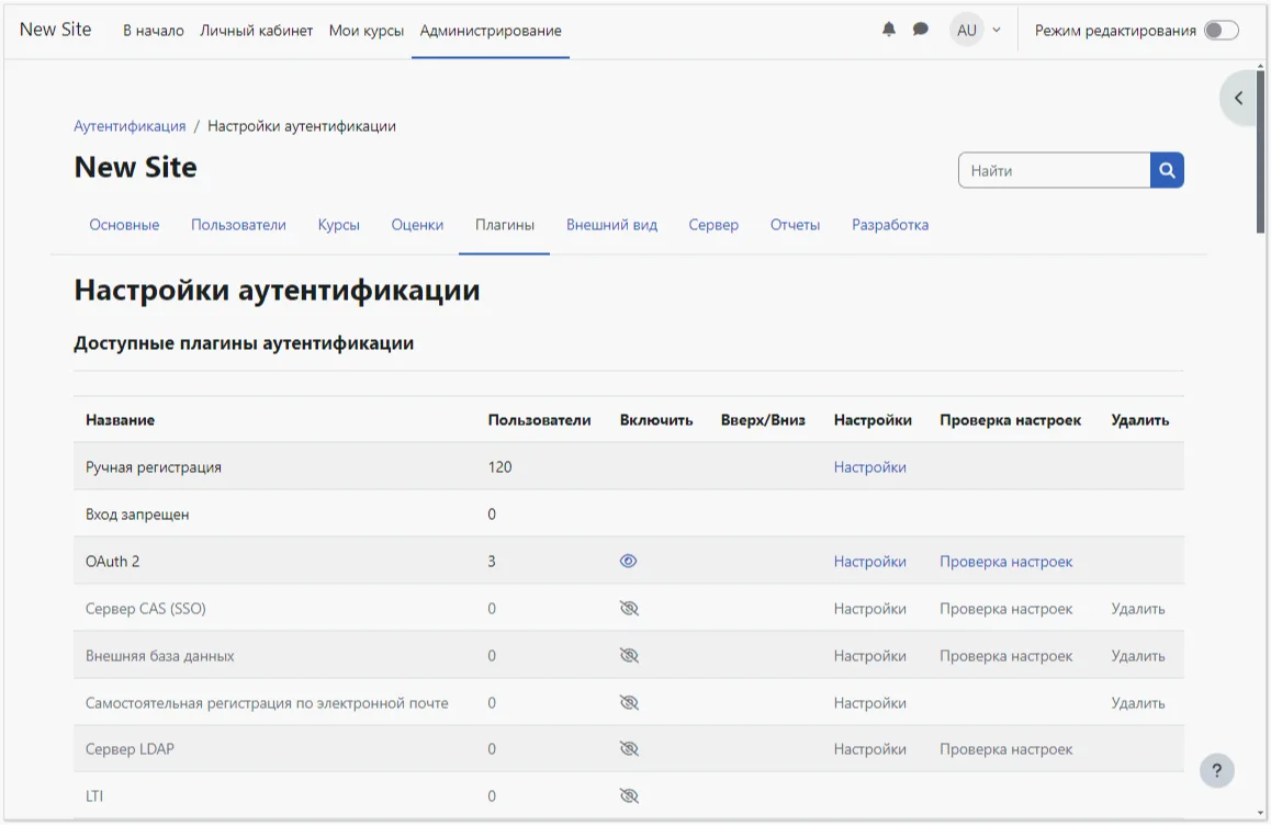 Для настройки авторизации пользователей требуются права администратора в системе дистанционного обучения Moodle.