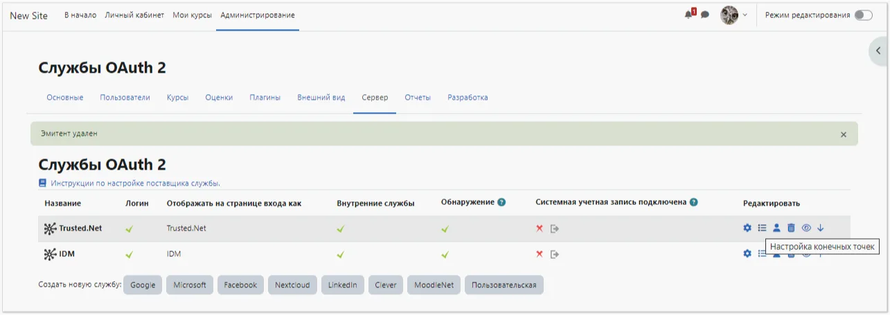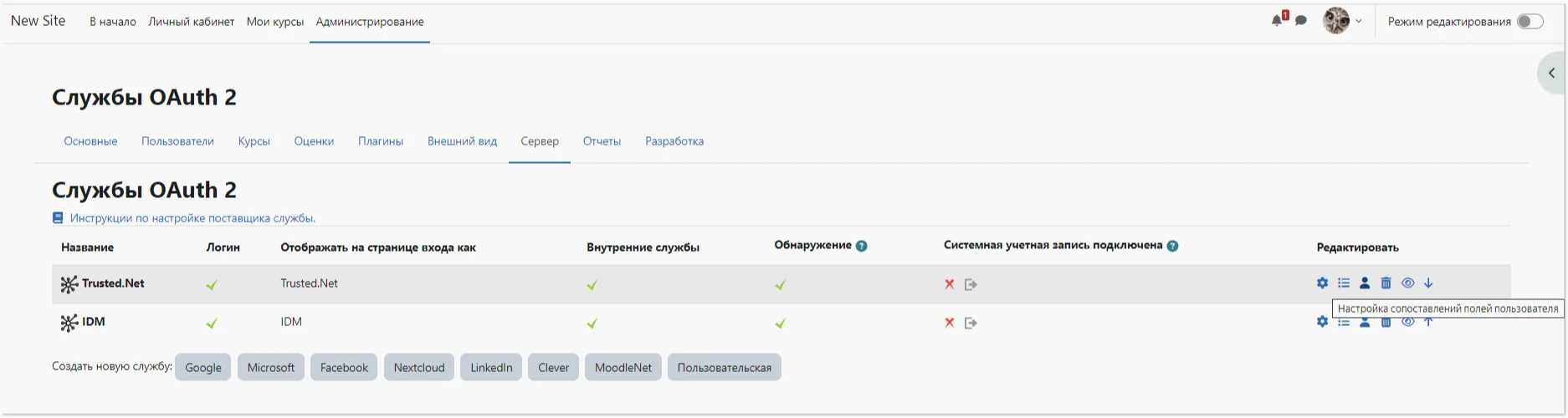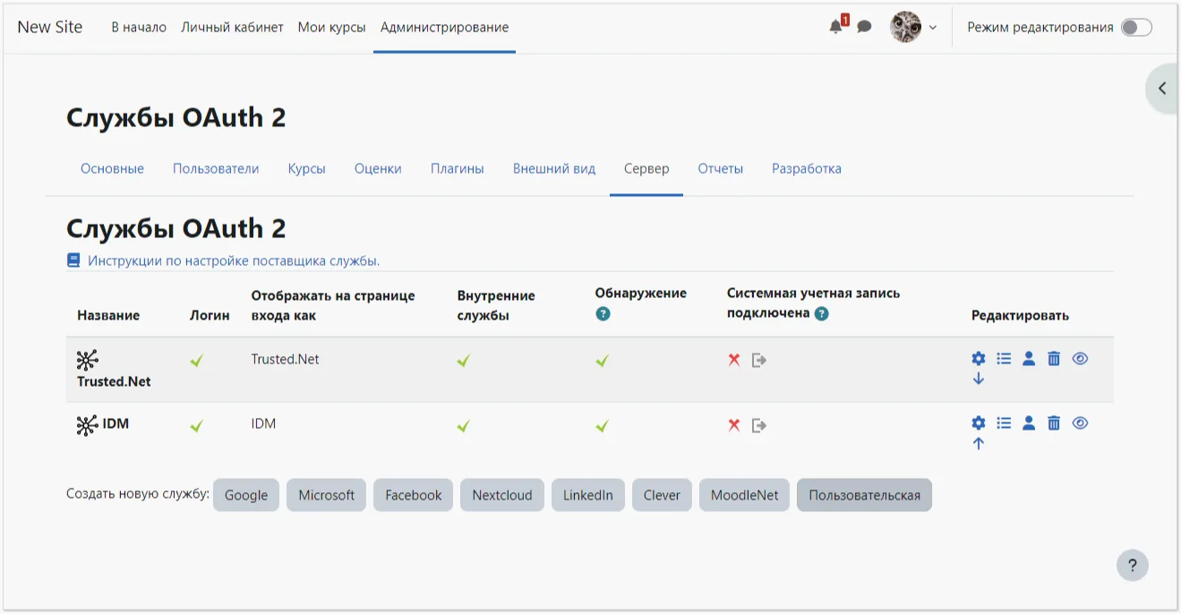 Перейдите в раздел Администрирование — Сервер — Службы OAuth2 и создайте провайдер, нажав кнопку Пользовательская.