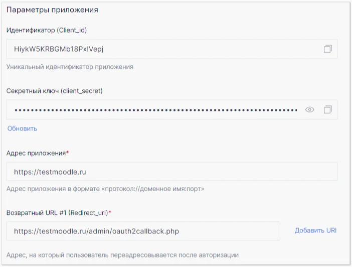 Возвратный URL #1 (Redirect_uri) - <адрес инсталляции Moodle>/admin/oauth2callback.php.