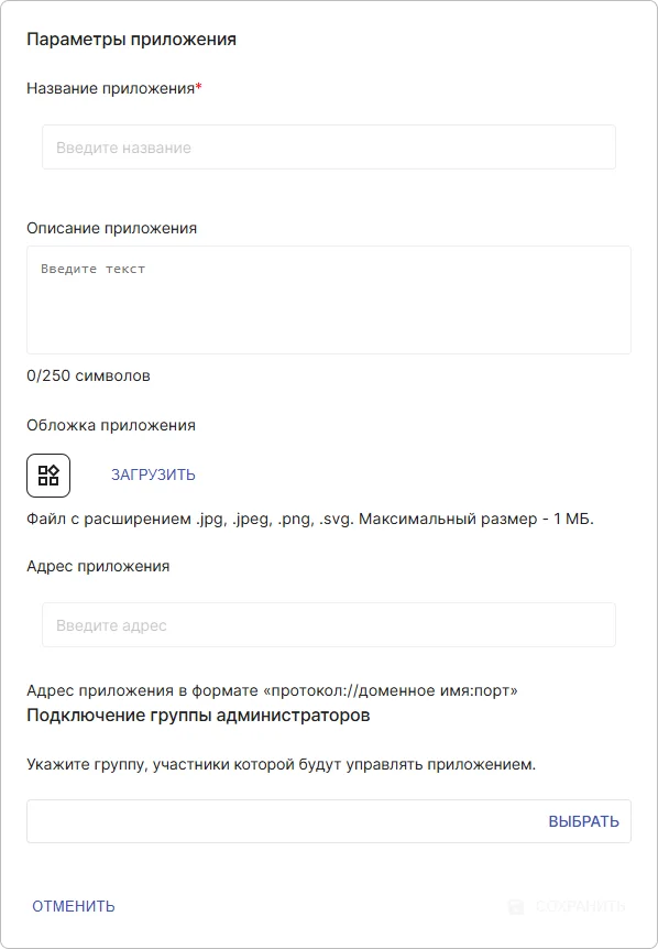 | Обложка приложения | Логотип приложения для отображения в интерфейсе системы IDM. Файл с расширением .jpg, .jpeg, .png, .svg. Максимальный размер - 1 МБ. | Нет |