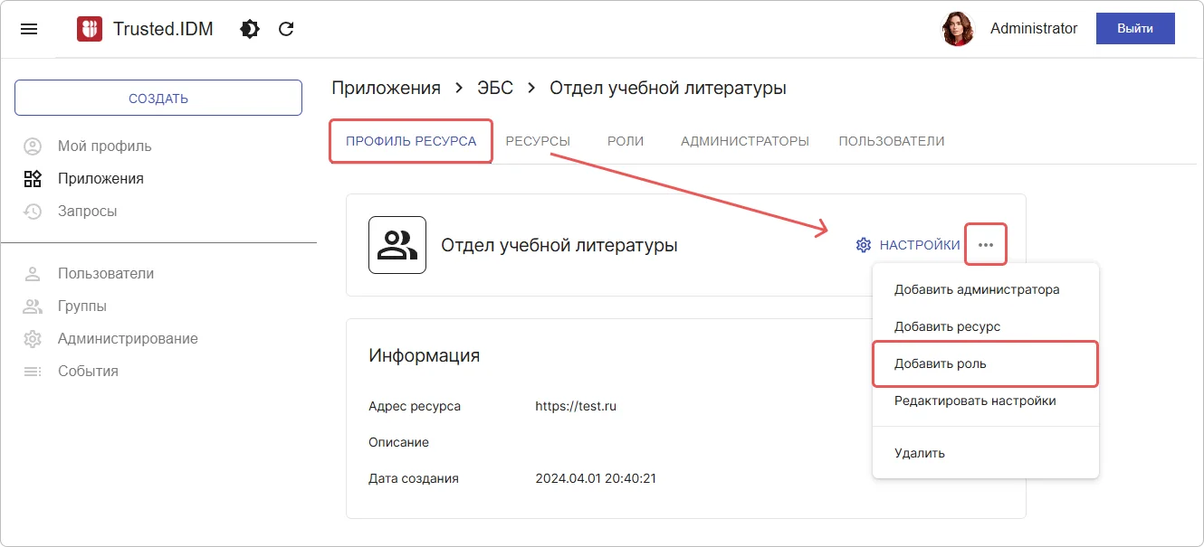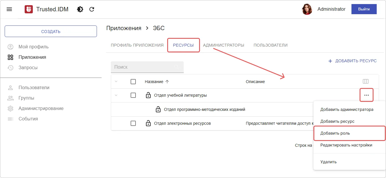 - на подключение в качестве группы администраторов приложений и ресурсов;