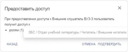 Если проверки не пройдены, отображается информационное сообщение о предоставлении или потере дополнительных доступов.