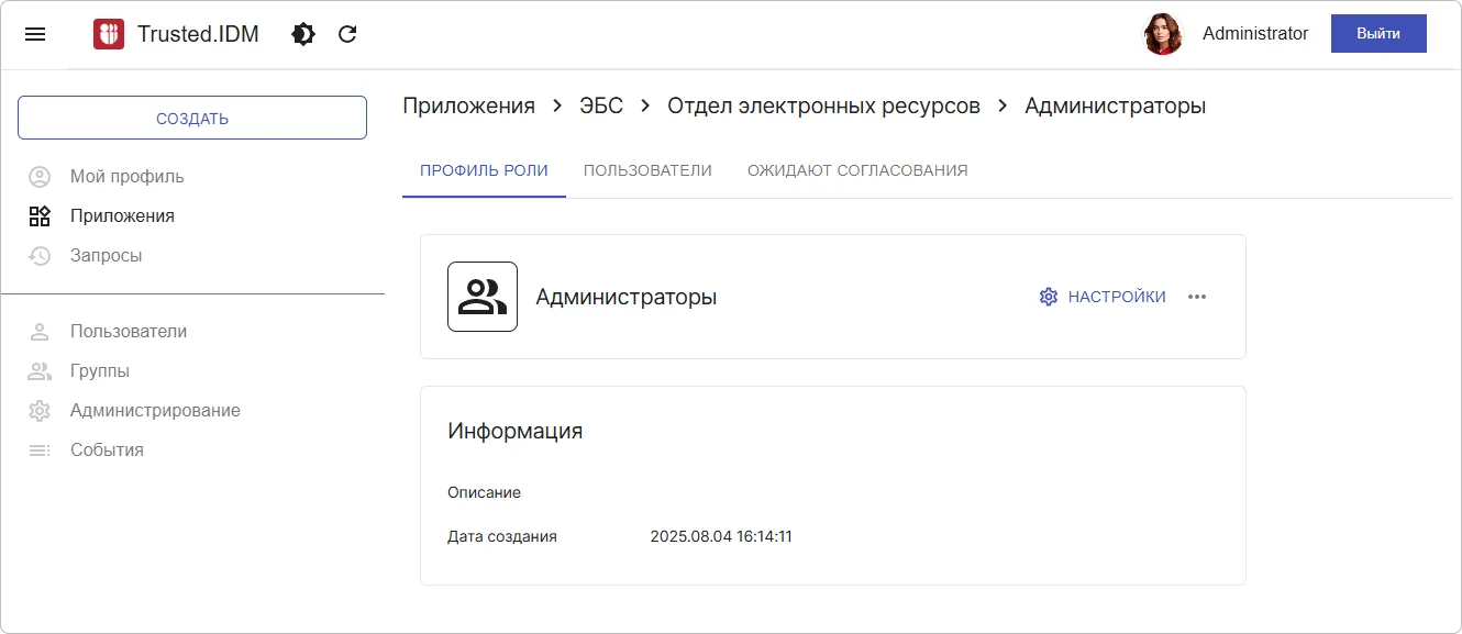 - Профиль роли – просмотр и редактирование основной информации о роли,