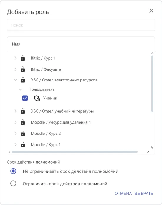 - Ограничить срок действия полномочий — это означает, что полномочия будут иметь ограниченный период действия. Чтобы установить дату окончания полномочий, введите ее или выберите из календаря.После наступления указанной даты пользователь лишится предоставляемых прав.