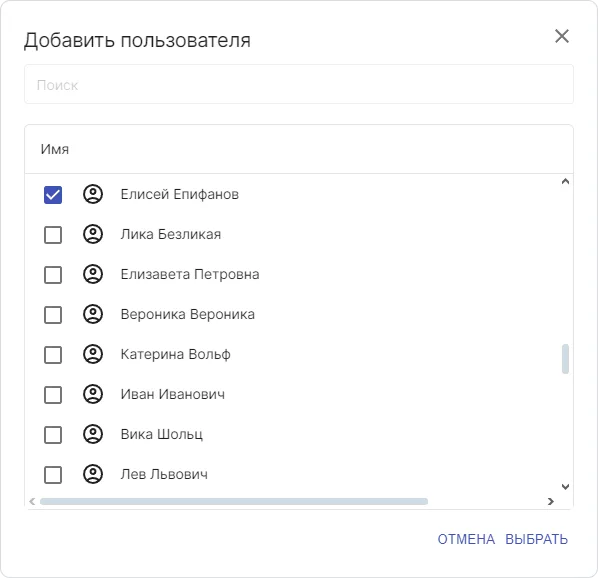 В открывшемся окне Добавить пользователя выберите одного или нескольких пользователей. При необходимости воспользуйтесь поиском.