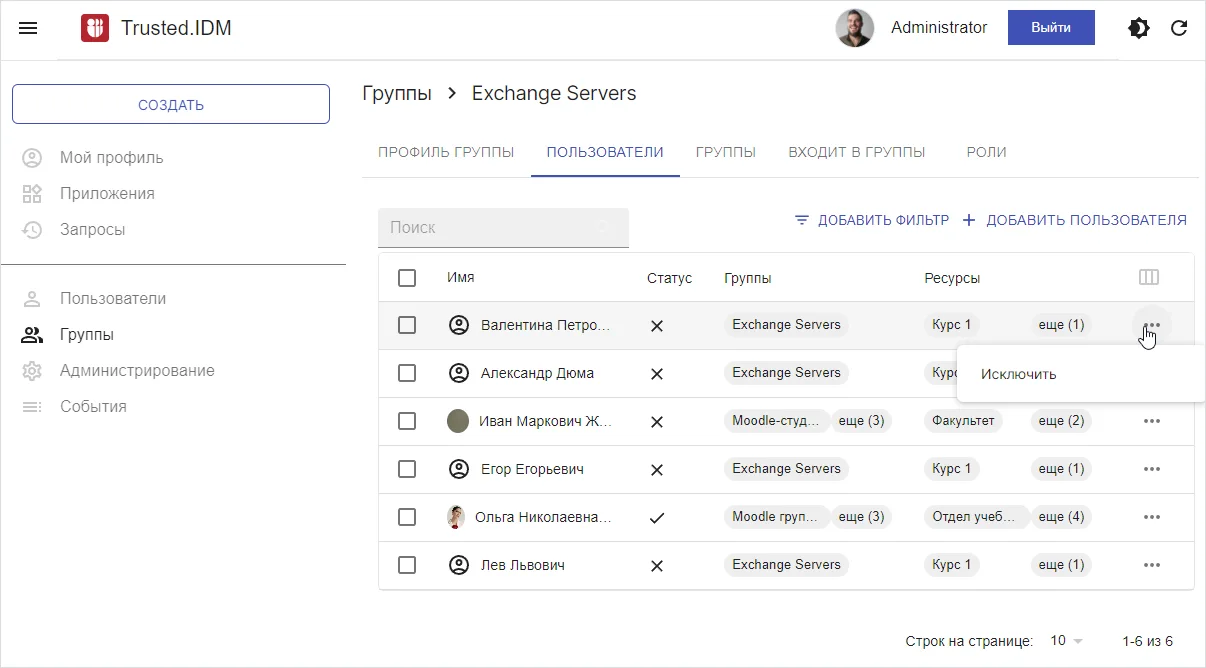 Исключение пользователя из группы#