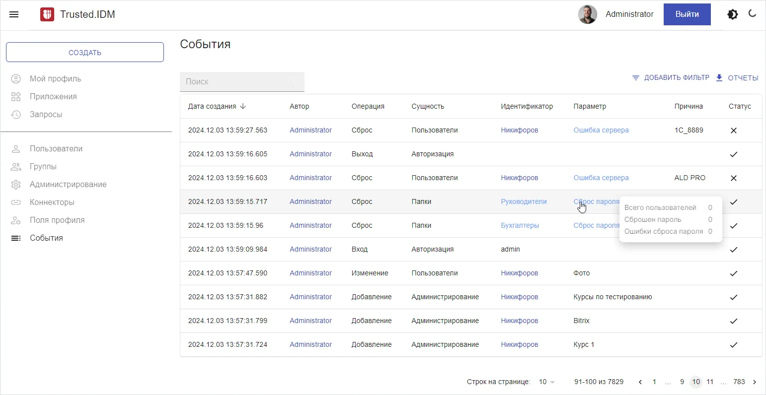 Для ряда событий в системе можно посмотреть подробные сведения о результатах. К таким событиям могут относится синхронизация, групповой сброс пароля, ошибки при выполнении операции и другие.