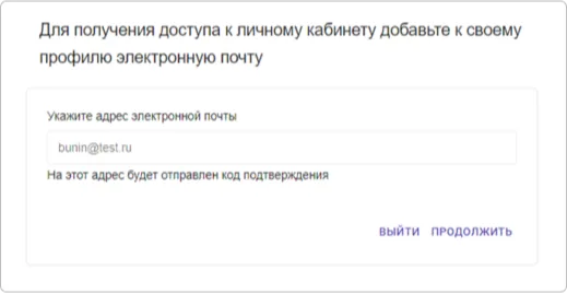 При отсутствии email-адреса в профиле, система автоматически перенаправляет пользователя на страницу добавления электронной почты: