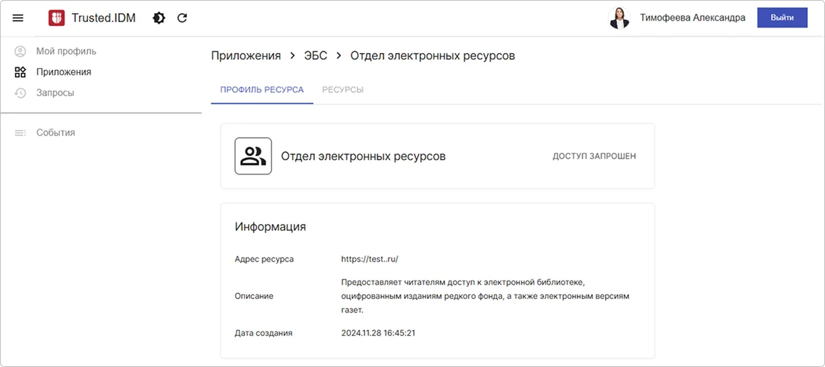 3. Пример профиля ресурса с предоставленным доступом:
