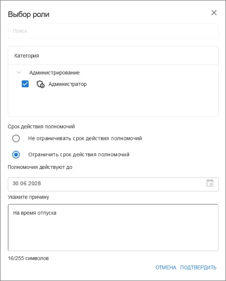 - Ограничить срок действия полномочий, если доступ предоставляется на время. Ввести дату или выбрать из календаря. После наступления указанной даты пользователь теряет доступ к ресурсу.